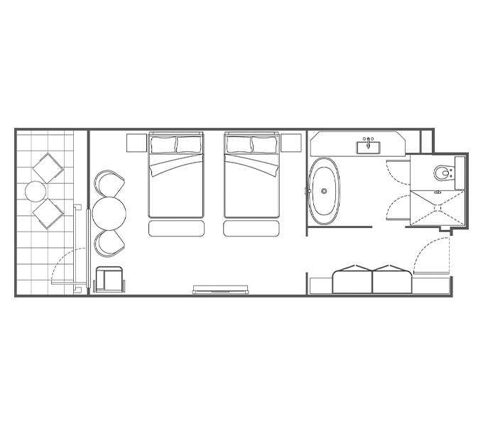 Perfect for friends or family traveling together, each room includes two queen-sized beds, a spacious balcony overlooking the gardens, and a luxurious bathroom equipped with a bathtub, a separate walk-in shower, and a vanity station.