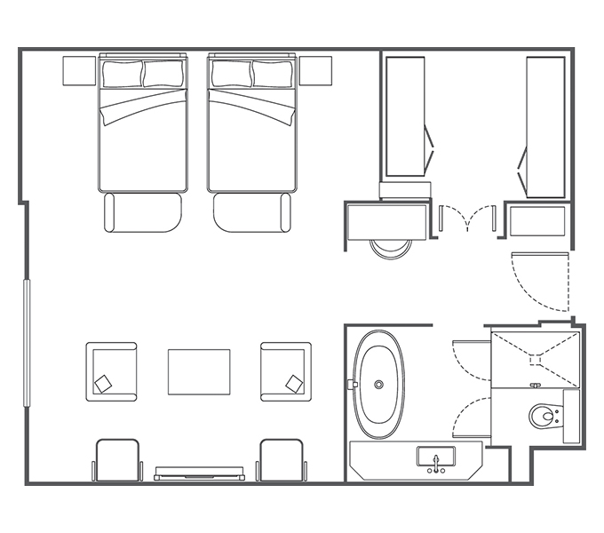 Providing ample space for families and friends travelling together, each room contains two queen sized beds, a dressing table and a dressing area. The spacious bathrooms feature a bathtub, a separate walk-in shower and a vanity station.