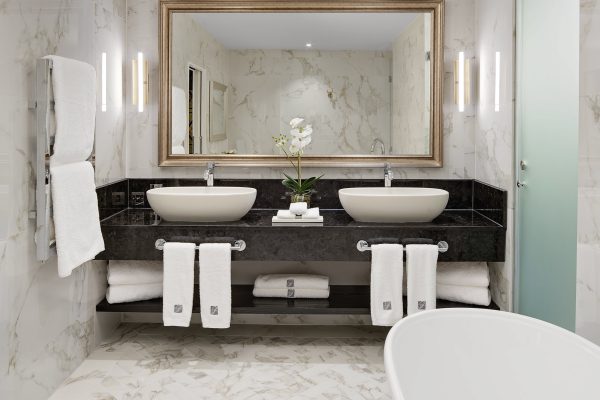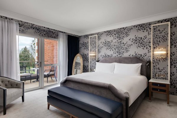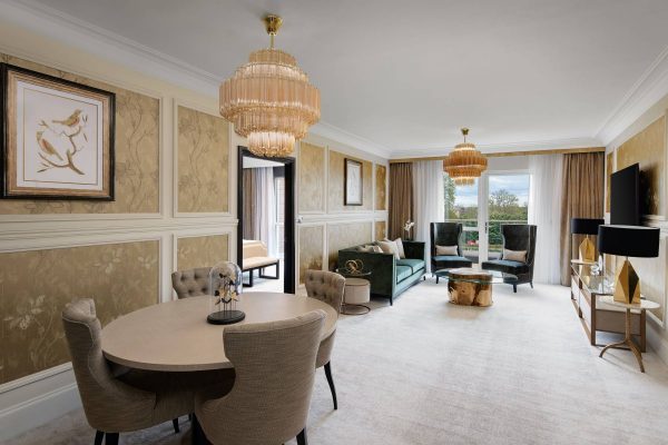 Thoughtfully designed and spacious, each suite features a private balcony overlooking our South Lawn, as well as a living room with a dining area, and a cocktail bar. Additionally, there is a desk working area, a separate bedroom with a king-sized bed, a dressing area and an opulent bathroom featuring a bathtub, separate walk-in shower and a vanity station.